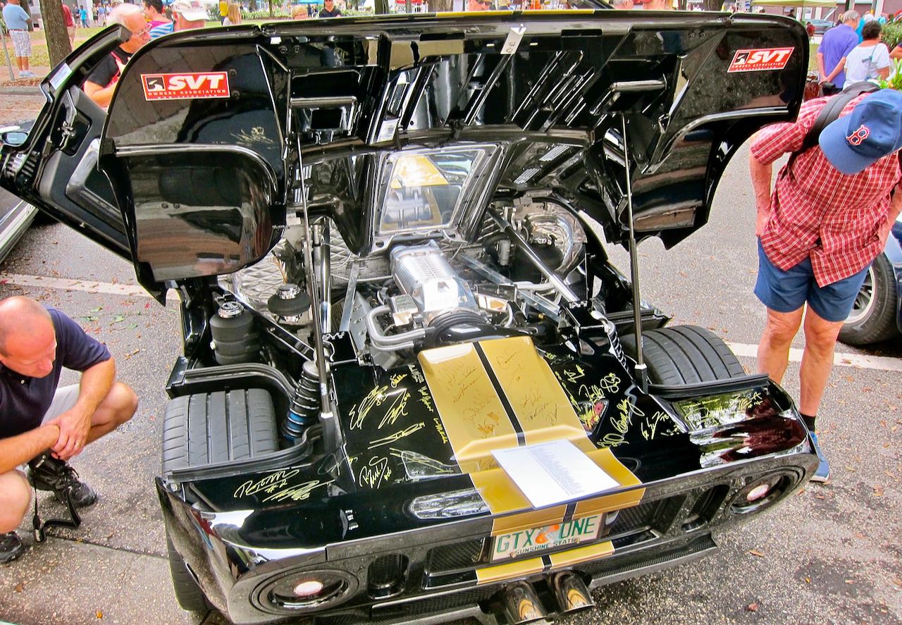 A FoMoCo-sanctioned conversion called the GTX1, below, conceived by Ford SVT engineer Kip Ewing and executed by Genaddi Design Group in Wisconsin, was available for a short time after debuting to rave reviews at the 2005 SEMA Show. It features four removable roof panels, a power-retractable backlite, and a redesigned clamshell deck with a glass panel to expose the engine. It allowed the car to be fully open, fully closed, or to run like a T-top, and all four panels could be stowed within the car. Special five-spoke alloy wheels, 19 x 9- and 20 x 11.5-inches front and rear, were included. It’s believed fewer than 50 GTs were altered.