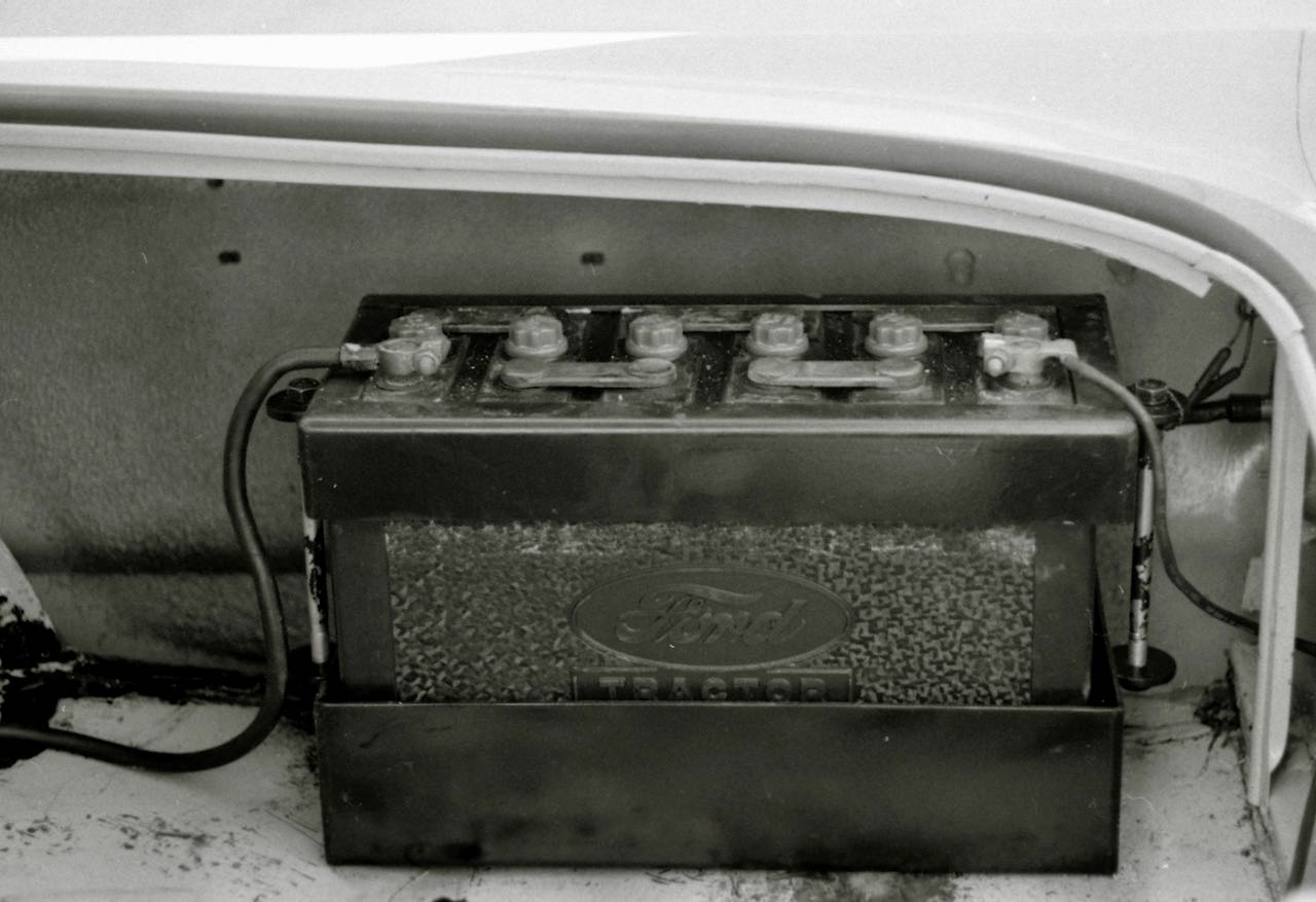 Increasing horsepower is relatively easy compared with getting power to the pavement. Completing the chassis “loading” was the fabrication of a pair of boxed steel traction bars, similar in design to the ones used on 427 Galaxie Lightweights and later on Thunderbolts. The traction bars measure 31 inches long and run from the axle housing forward to chassis mounting points which added structural rigidity and aided in weight transfer. A trunk-mounted 95-pound battery sits over the right rear wheel.
