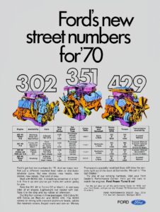 The big news in Dearborn was a new SportsRoof ’70 FORD TORINO COBRA with matte black hood, shaker scoop, and standard 429/360 Cobra V-8. It had a 1.9-inch wider tread, 1.2-inch lower roofline, and a radical 57.5-degree windshield slope angle. Options included a Super Cobra Jet 429/370 with Drag Pack, oil cooler, and 780-cfm Holley carb. Some cars carried a 375-horsepower rating.