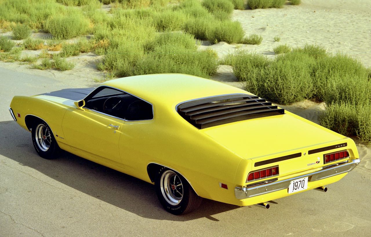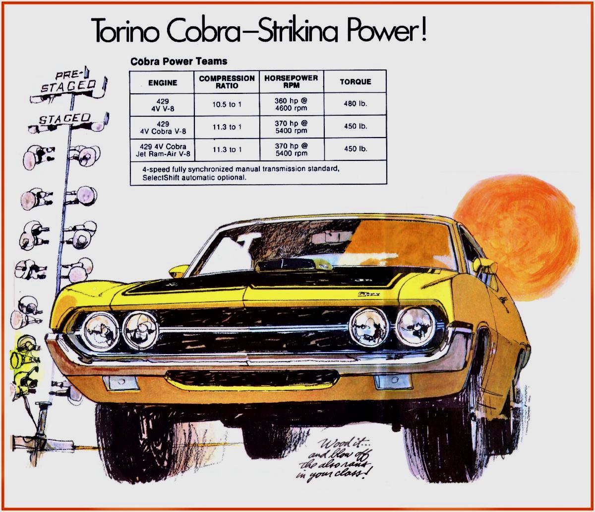 All new styling and engine options up to and including the 429 SCJ turn the Fairlane into the ’70 FORD TORINO COBRA, a maximum muscle Supercar.