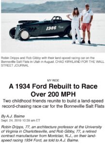 Noted author A.J. Baime celebrated their relationship and their ’34 Ford E/STR Bonneville racecar in a MY RIDE feature article, right,  in the Wall Street Journal on September 24th, 2019: A 1934 Ford Rebuilt to Run Over 200 MPH – Two childhood friends reunite to build a land-speed record-chasing race car for the Bonneville Salt Flats.