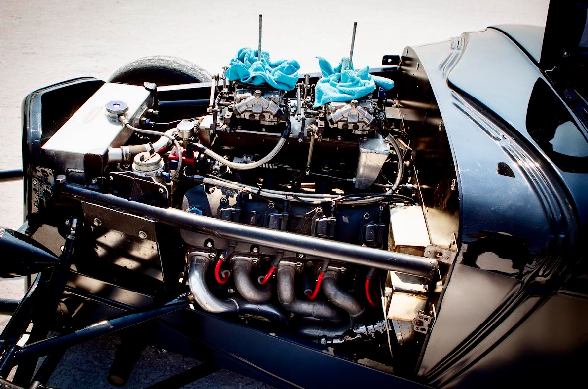 DRIPPS & GIBBY SHARE A PASSION FOR SPEED, and that includes respect for small-block Chevrolet engines, dating back to the construction of their first hot rods and Bonneville racer. Built by the highly respected engine builder Ken Duttweiler, whose powerplants are used in the land-speed-record-holding Speed Demon Team cars, the ’34 roadster is powered by a naturally aspirated, short-stroke 259-cubic-inch, 650-665-horsepower Dart/Chevy small-block. It’s topped off with a pair of Quick Fuel 850-cfm carburetors mounted on a custom Hogan intake manifold.