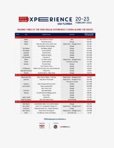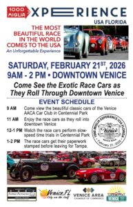 Starting on February 20th in Naples, Fl, the first Stamp Check, Passage Control, and Time Trials for 135 entered cars in the MILLE MIGLIA: EXPERIENCE FLORIDA will be in downtown Venice, FL (for its second year) at 11:30 a.m. to 1:30 p.m. on Saturday, February 21st.